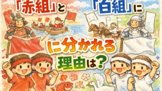 運動会で赤組・白組に分かれるのはなぜなのでしょうか。源平合戦の赤旗・白旗を手がかりに、紅白の意味や、なぜ「赤白」ではなく「紅白」と呼ばれるのかまで、子どもにも伝えやすい言葉で丁寧に解説します。