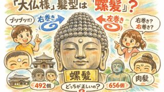 大仏の頭のブツブツは「螺髪(らほつ)」です。右巻き・左巻きの見方、白毫(びゃくごう)/肉髻(にっけい)との違い、東大寺492個・鎌倉656個のデータまで、家族に説明できるレベルでまとめました。