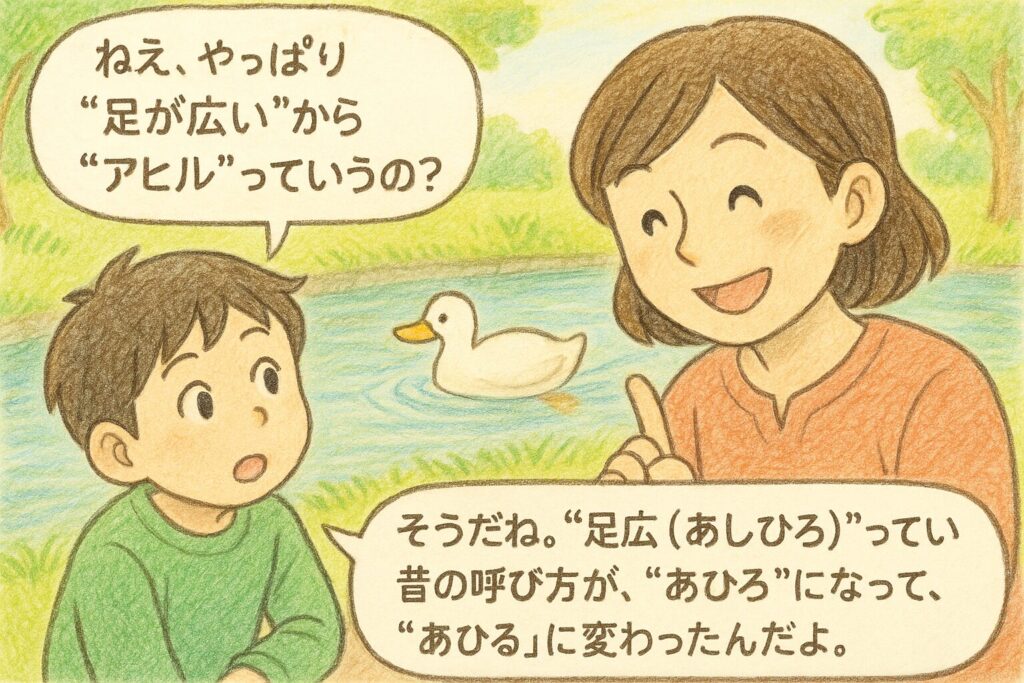 「そうだね。“足広(あしひろ)”っていう昔の呼び方が、“あひろ”になって、“あひる”に変わったんだよ。だから見た目から来た名前っていうのは、あながち間違いじゃないんだ。ただし他にも説があるんだよ。」