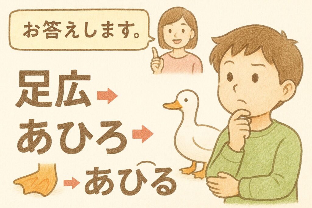🪶 今日、あなたが覚えた「足広(あしひろ)→あひろ→あひる」という流れ。