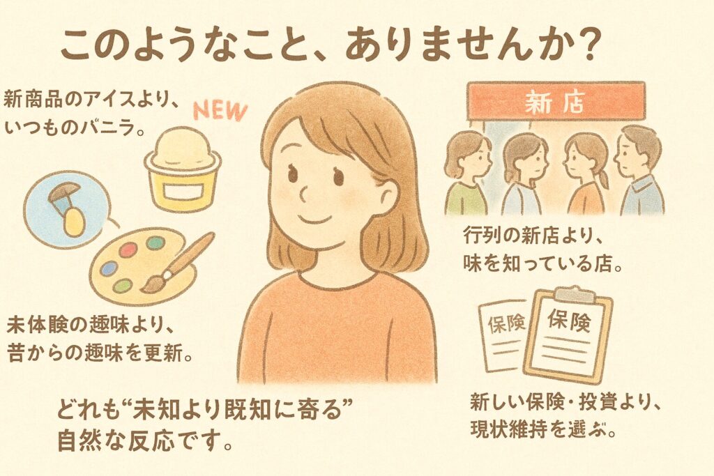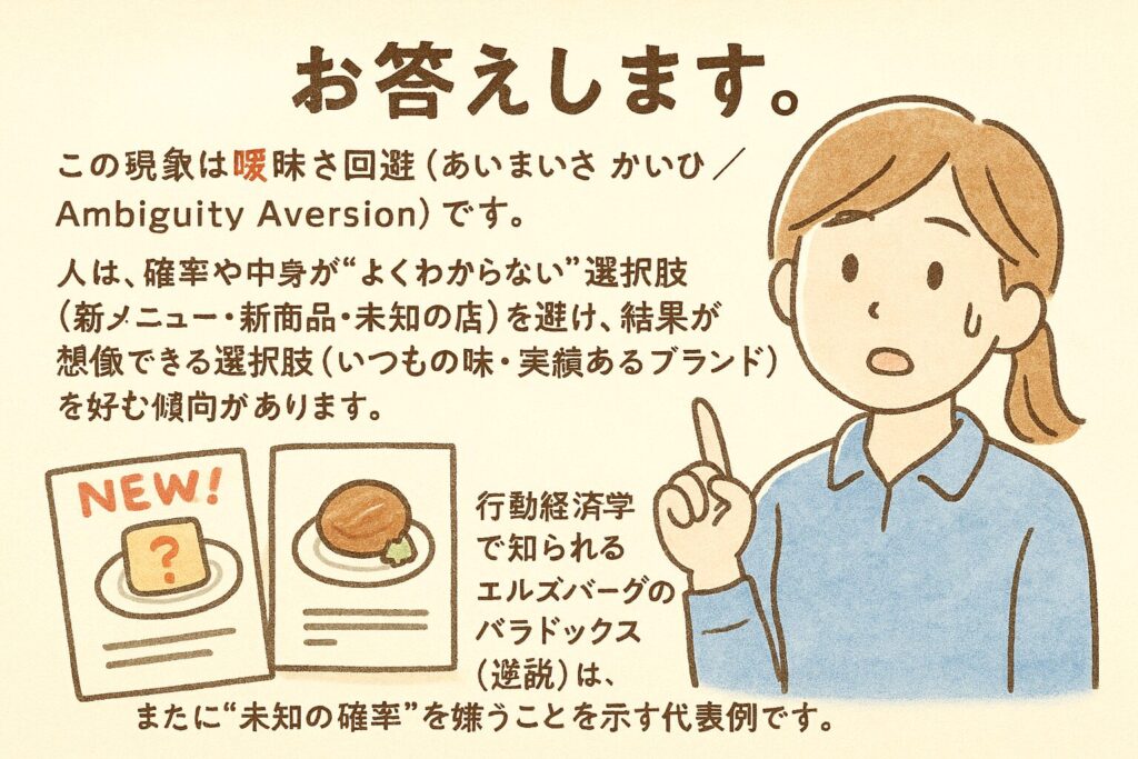人は、確率や中身が“よくわからない”選択肢(新メニュー・新商品・未知の店)を避け、結果が想像できる選択肢(いつもの味・実績あるブランド)を好む傾向