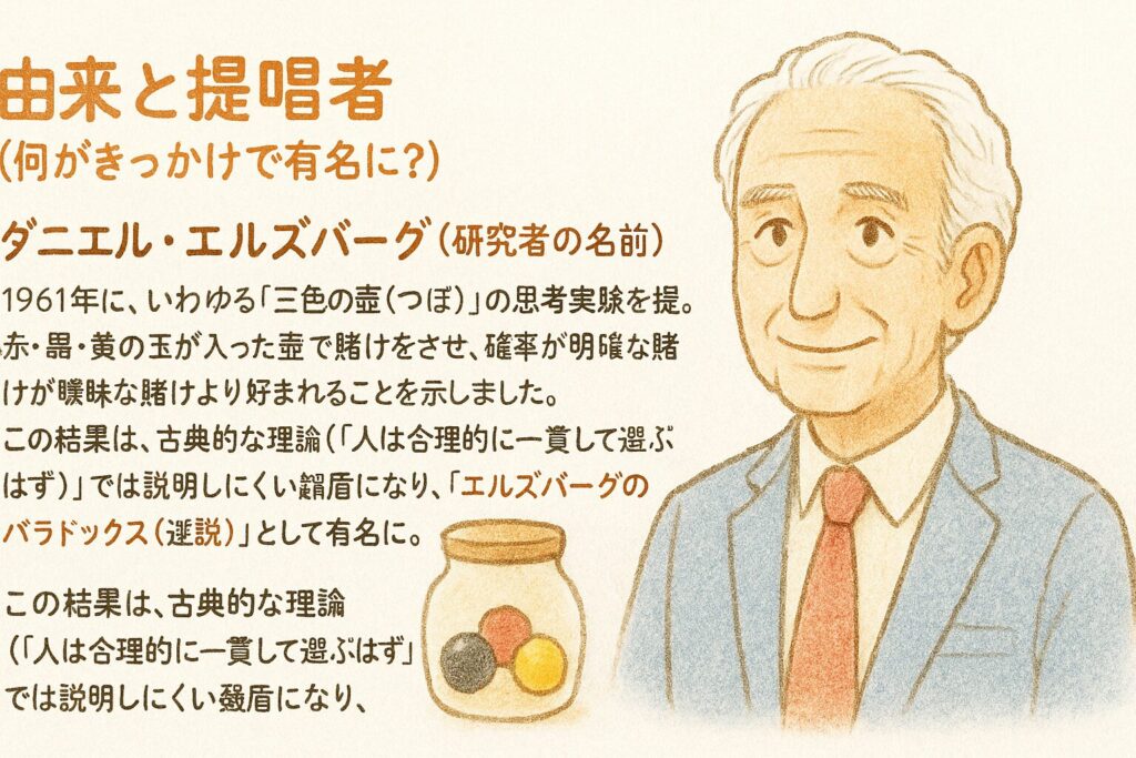 行動経済学で知られる**エルズバーグのパラドックス(逆説)**は、人は“未知の確率”を嫌うことを示す代表例です。