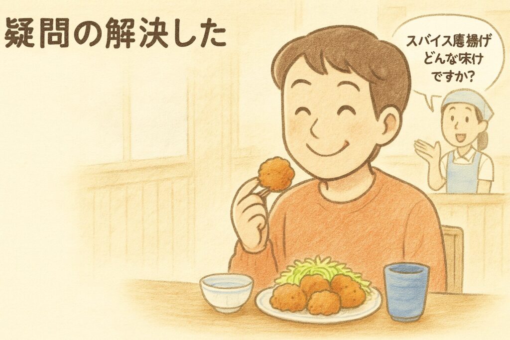 私は店員さんに「スパイス唐揚げって、どんな味付けですか?」と聞いてみました。