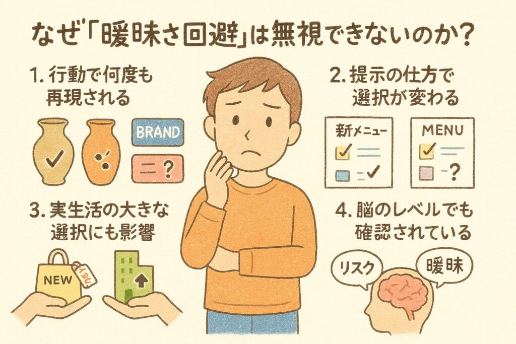 「そうか、あの時“新しいものを避けた”のは、**曖昧さ回避(あいまいさ かいひ)**っていう心理だったんだ。」