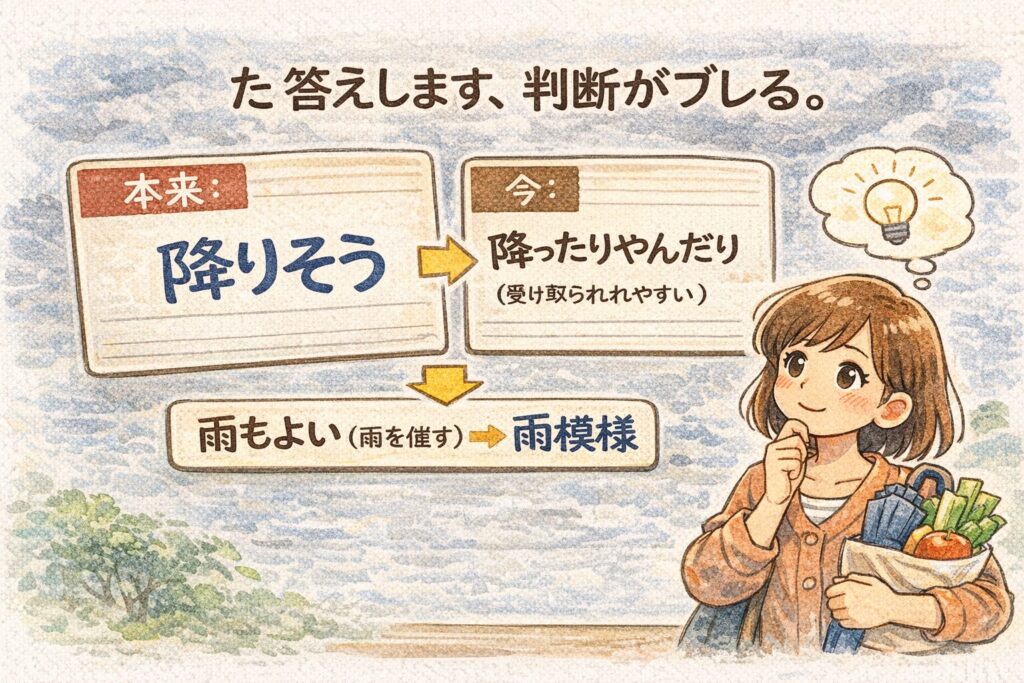ただ、雨模様は“誤解が起きやすい言葉”なので、つまずきポイントも多いです。