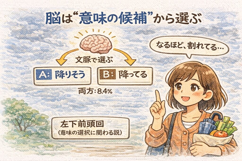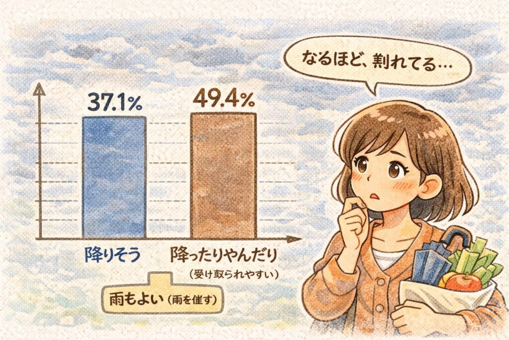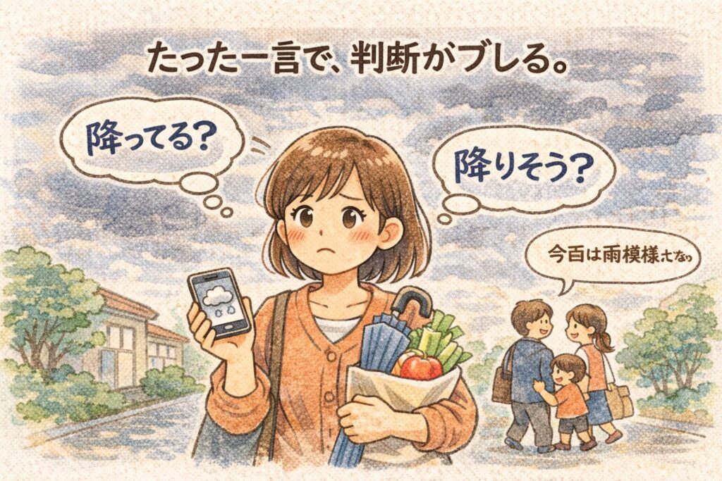 A. 調査では「降りそう」よりも「小雨が降ったりやんだり」を選ぶ人が多い年もあり、受け取りが割れることが分かっています。だから“自分は正しいのに通じない”が起きやすいんです。