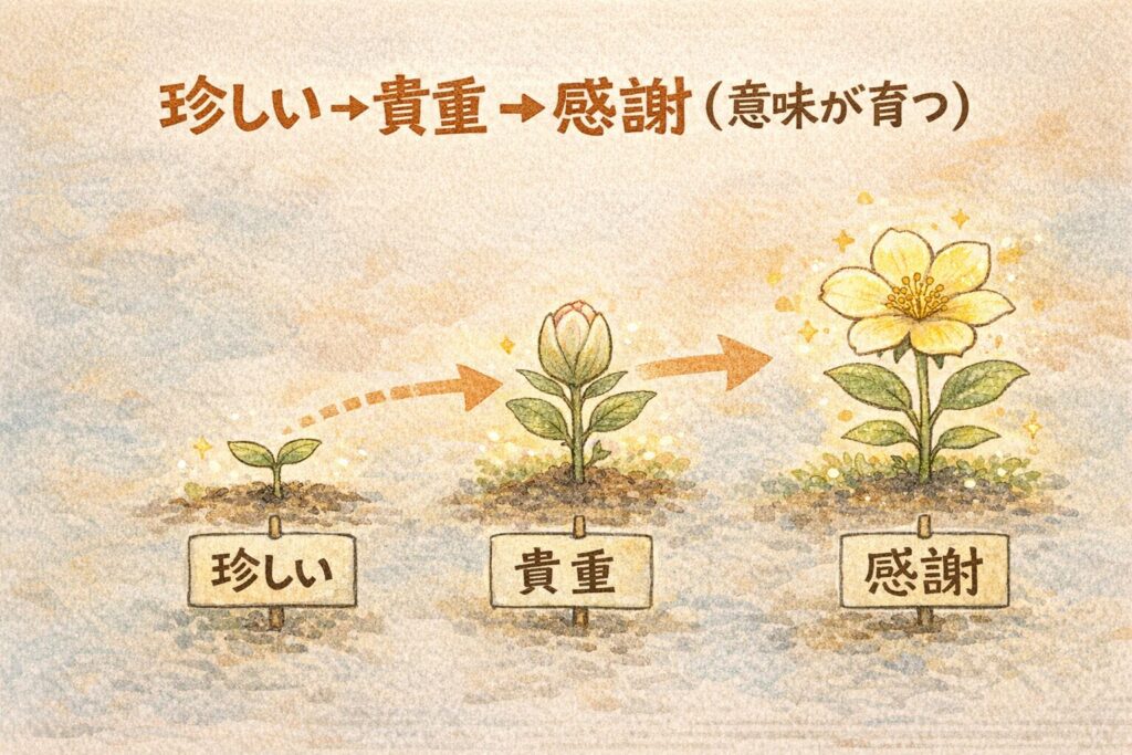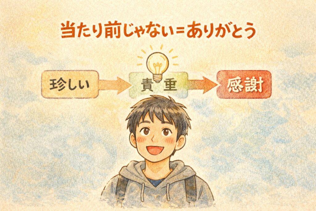 そしてその「めったにないほど貴重だ」という感覚が、だんだん「感謝」の意味として定着しました。