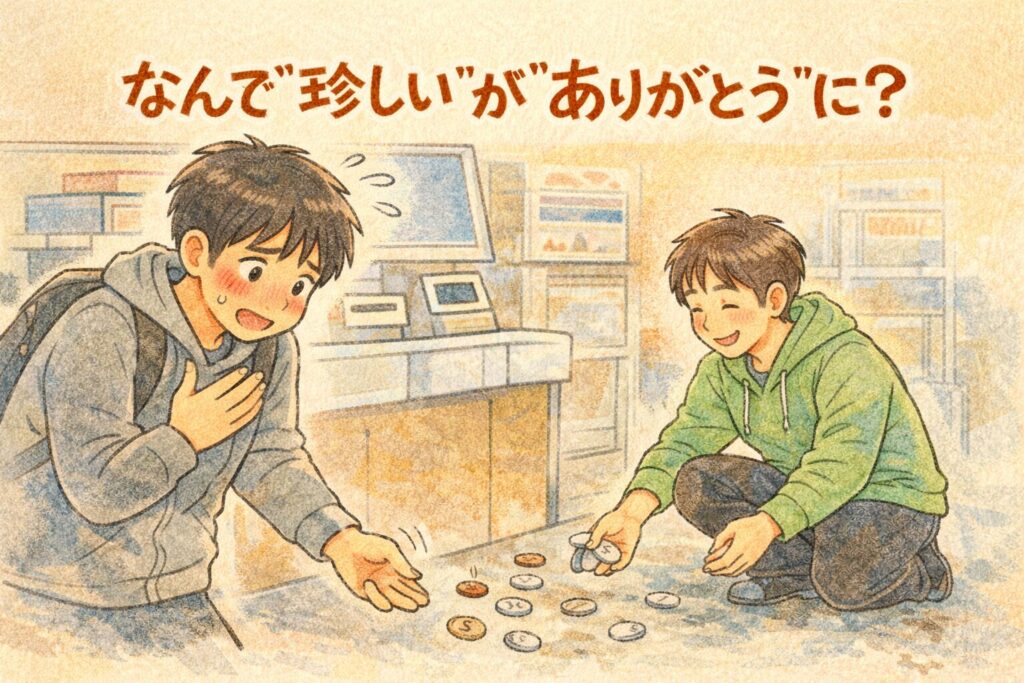 チャリン、チャリン、と硬貨が転がる音。レジ前の空気が一瞬だけ止まった気がして、顔が熱くなります。