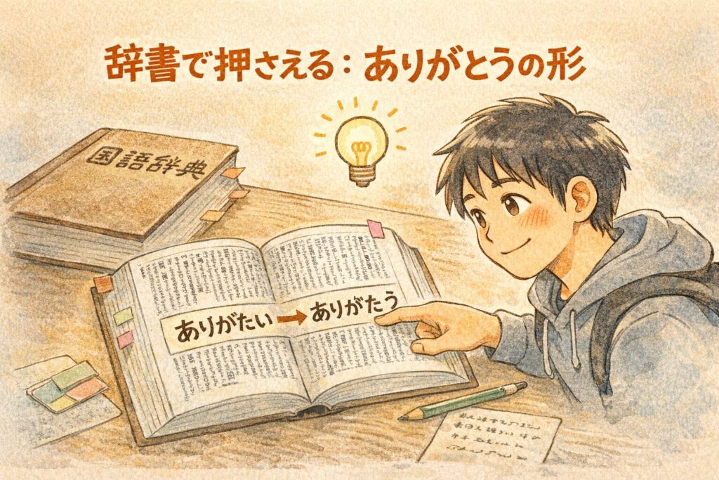 • ウ音便(うおんびん):「〜く」が変化して「〜う」っぽくなる音の変化(例:ありがたく→ありがたう)
