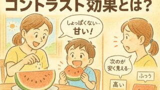 スイカに塩で甘く感じるのは味のコントラスト効果(対比効果)。0.1%NaCl付近の研究やSGLT1の可能性を小学生にもわかる言葉で紹介し、料理のコツから価格・印象の比較のワナまで一気に解説します。