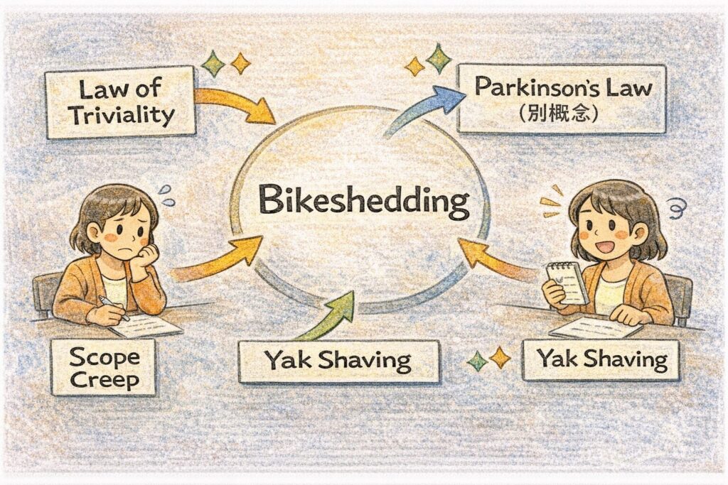 補足:「バイクシェディング」は日本語化された言い方、「bikeshedding」は英語の原語です。英語では Law of Triviality(ロー・オブ・トリビアリティ/凡俗法則) と呼ばれます。