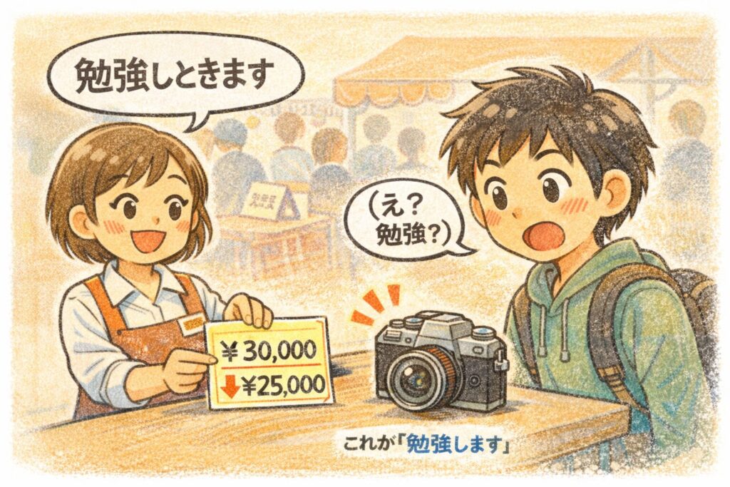 フリマの店主さんが言った「勉強しときます」は、