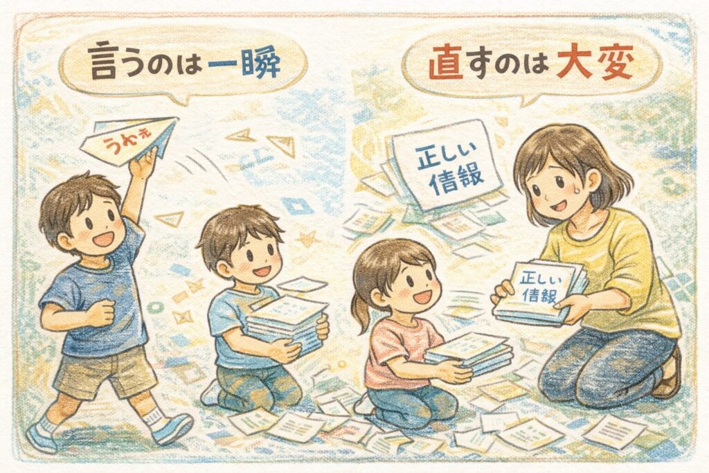 - でも、うわさを直すのは、散らばった紙をぜんぶ拾って、正しい紙を配り直すみたいに大変。