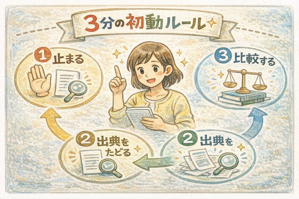 「まず止まる。次に出典を見る。最後に短く伝える」