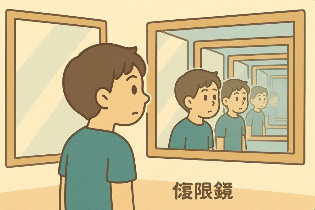 合わせ鏡で見える“奥へ続くトンネル”は、二枚の(あるいは複数の)鏡が互いに反射をくり返すことで生じる物理的な反射の連鎖=無限鏡です。ドロステ効果は**「絵(写真)の中に“自分自身”を正しい位置関係で描く**」自己参照の構図のトリックで、現象の原理が異なる点に注意しましょう(見え方は似ていても、定義は別)。