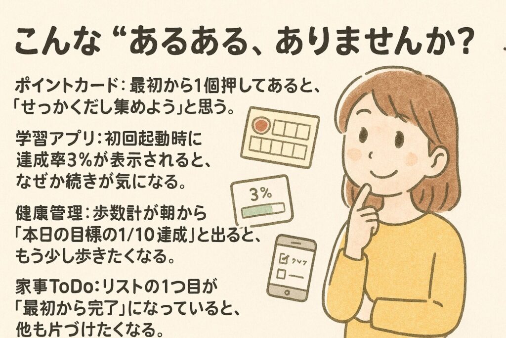 → 最初から少し“進んでいる状態”を与えられると、目標を最後までやり切りやすくなる心理のことです。