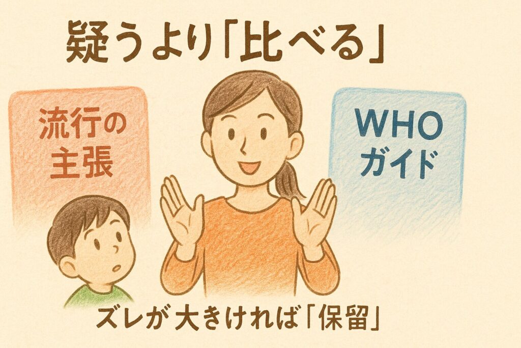 A. 否定せず「比べてみよう」と物差しを並べ、**“完全否定”を“頻度調整”**に言い換える。