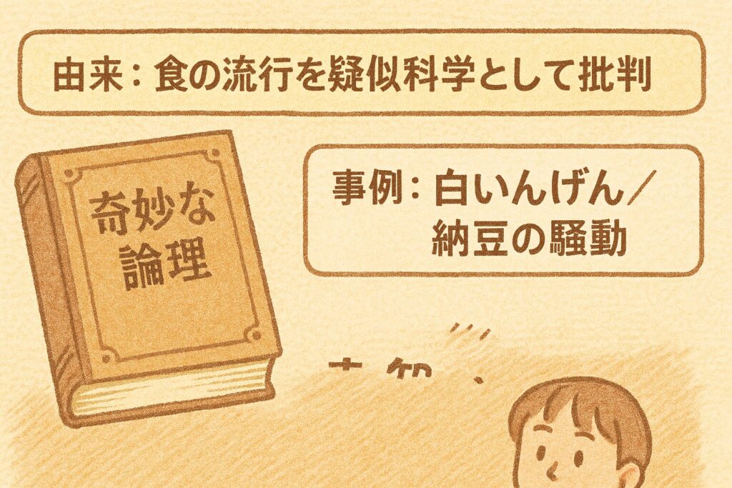 語源は英語の** food faddism(フード・ファディズム)。概念が広く知られる契機になった古典として、科学・数学ライターマーティン・ガードナー(Martin Gardner)の著作『Fads and Fallacies in the Name of Science(フェッズ・アンド・ファラシーズ/邦題:奇妙な論理)』があります。彼は擬似科学(ぎじかがく:科学の形をしているが検証が弱い考え)の代表例として“食の流行”**を批判的に紹介しました。