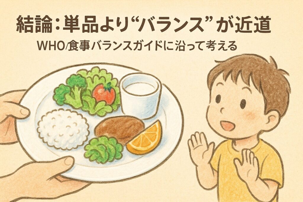 フードファディズム=科学的根拠が不十分なまま、特定の食品を“良い/悪い”と過大評価してしまう傾向。偏った食事や健康被害につながり得るため、**公的ガイド(WHO・食事バランスガイド)に沿う「バランス重視」**が安全策です。