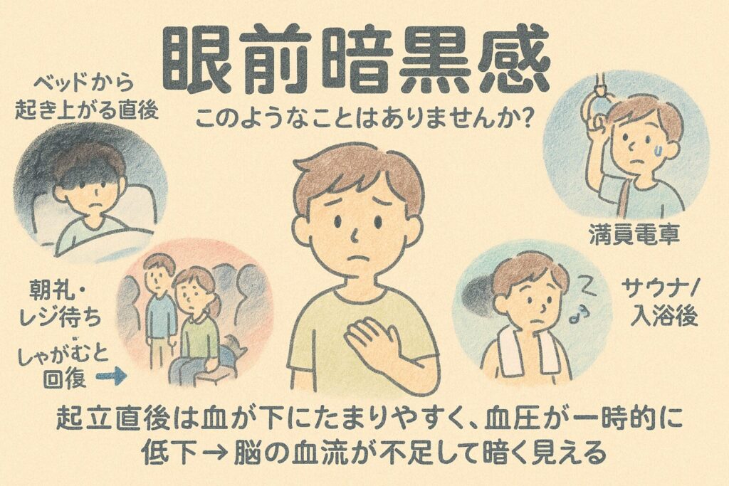 この「目の前が真っ暗」は眼前暗黒感起立など姿勢の変化血圧が一時的に下がり脳への血流(けつりゅう)が不足して起こります。医学的には起立性低血圧や**血管迷走神経失神(神経調節性失神)“前失神(ぜんしっしん)”**として扱われることがあります。