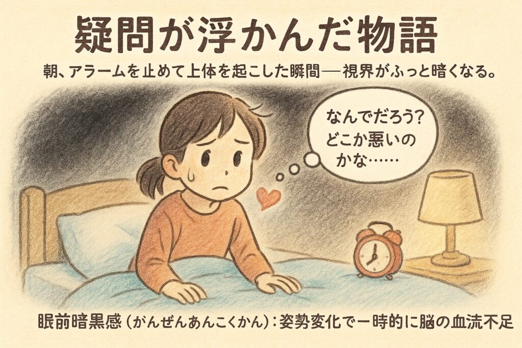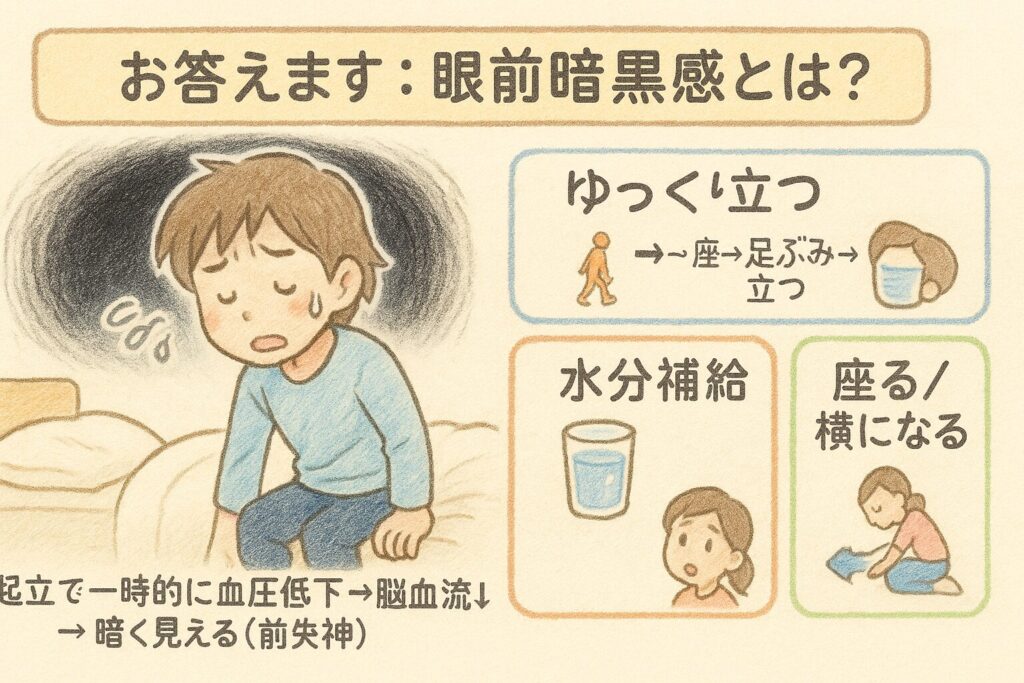 • 正体眼前暗黒感(がんぜん あんこくかん)は、立ち上がり直後などに脳への血流が一時的に不足して起こる“黒いシャッター”の感覚です。