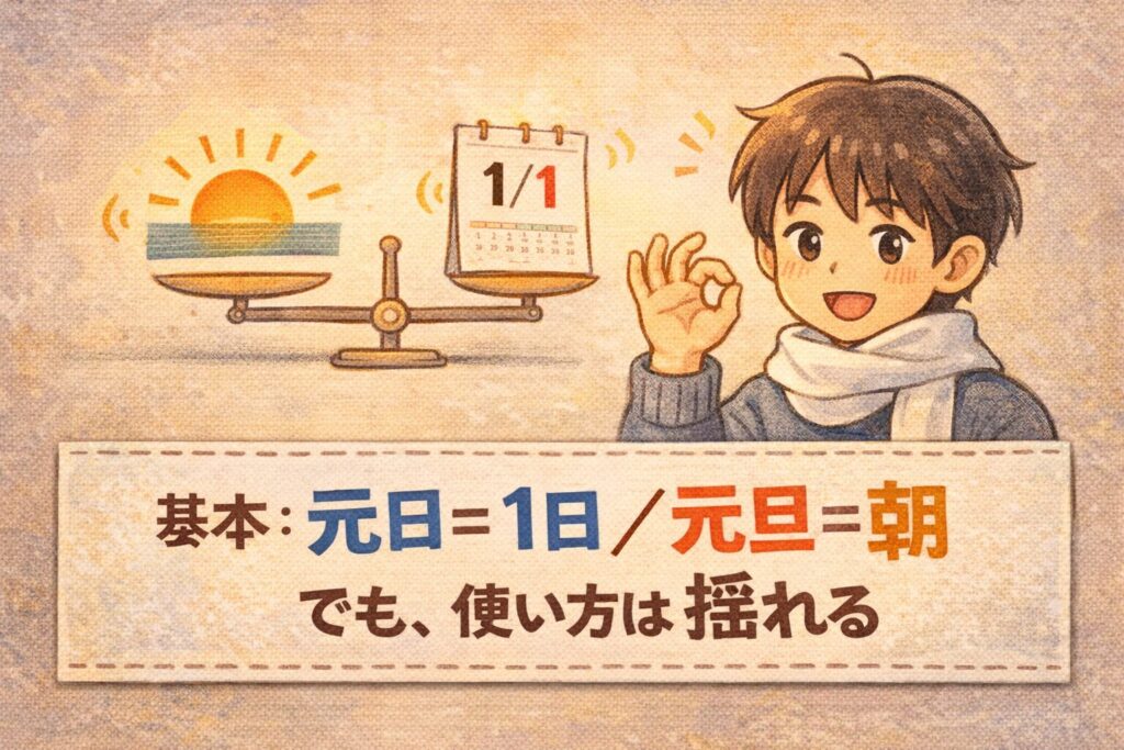 ただし、辞書には「元旦=(俗に)元日」と書くものもあり、現代では用法が揺れています。