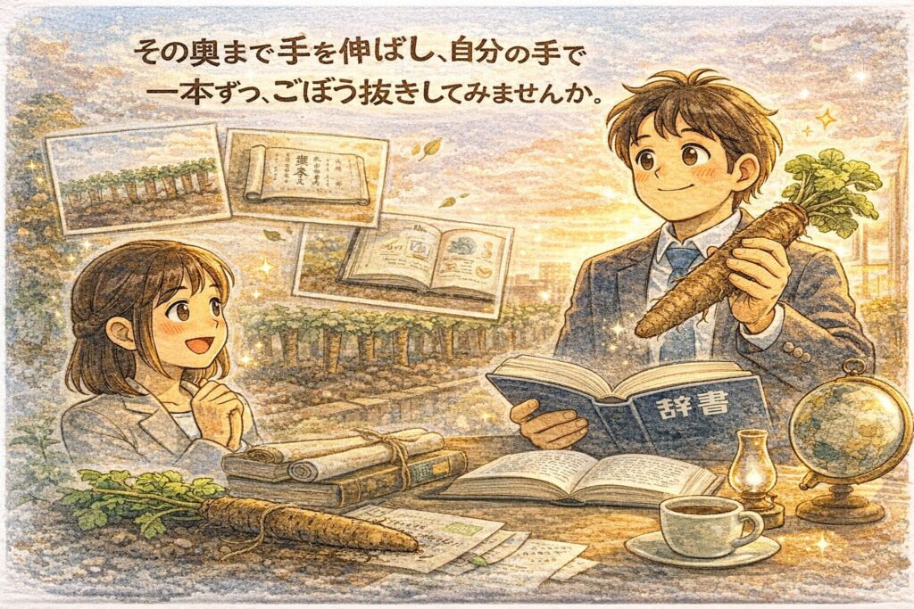 もしこのブログで少しでも心が動いたなら、今度は辞書や文献という“土の奥”まで手を伸ばして、あなた自身の手で一本ずつ、答えをごぼう抜きしてみてください。