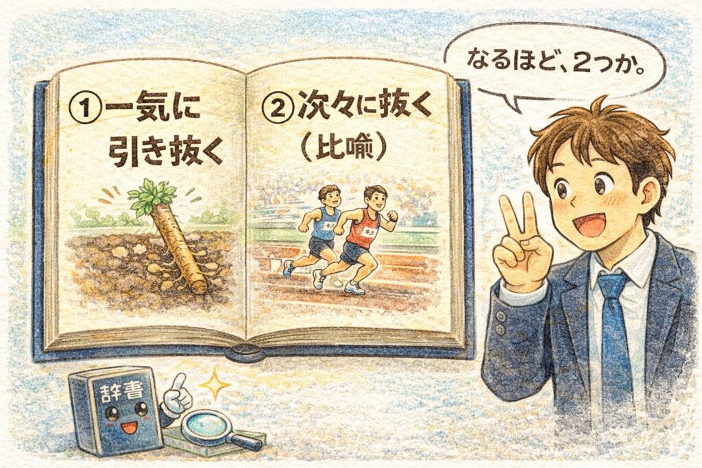 A. 辞書では、①棒状のものを力を入れて一気に引き抜く、②多くの中から一つずつ勢いよく抜く、さらに競走で数人を一気に抜く、という意味がまとめて載っています。
