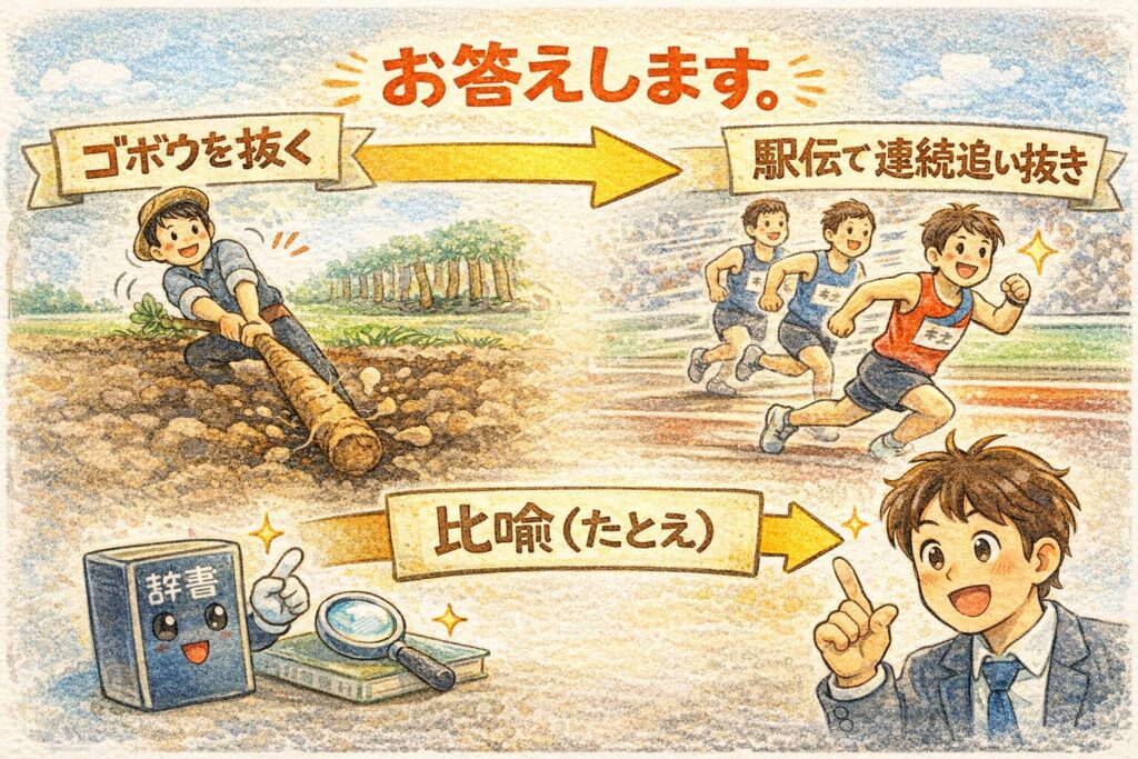 「ごぼう抜き」みたいな“比喩の言葉”は、似た表現が多くて混乱しやすいです。