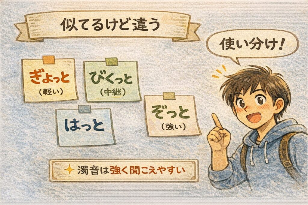 - 「ぎょっと」「びくっと」「ぞっと」みたいな“感覚の差”を、楽しく整理できます。