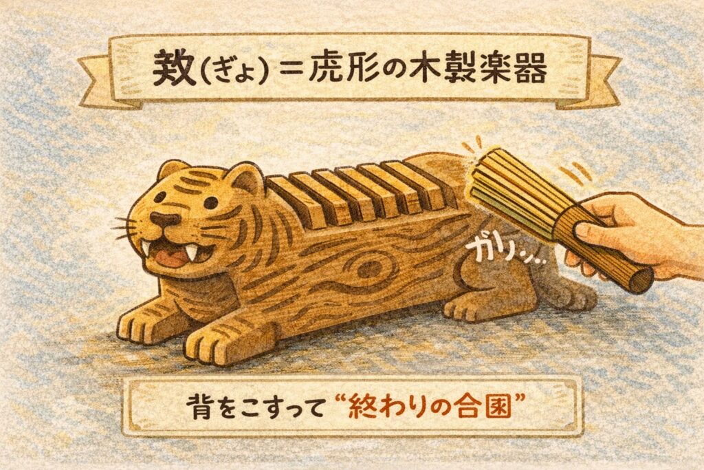 その『敔(ぎょ)』は、虎が伏した形の木製楽器で、背に刻みがあり、こすって鳴らし、奏楽を止める合図に使う、と百科事典・辞書で説明されています。