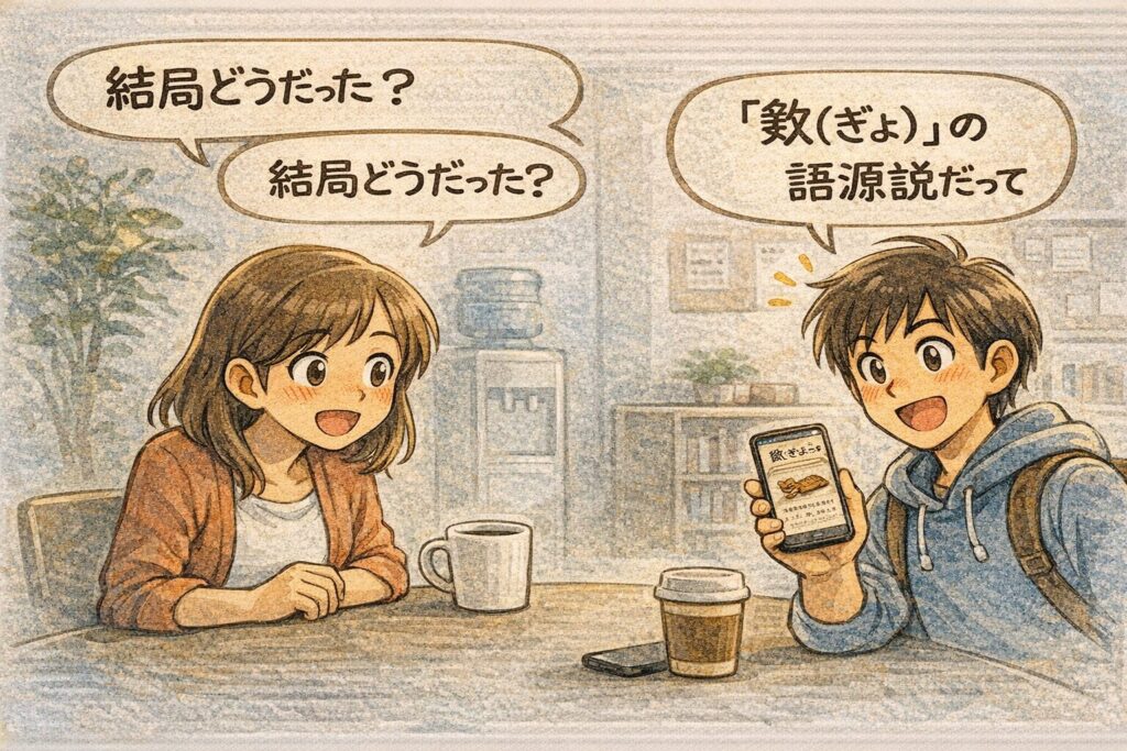 A. 辞典では、「中国古代の楽器『敔(ぎょ)』に由来する」という語源説が紹介されています。語源は決定打が残りにくいこともあるため、記事内でも「説」として扱うのが安全です。