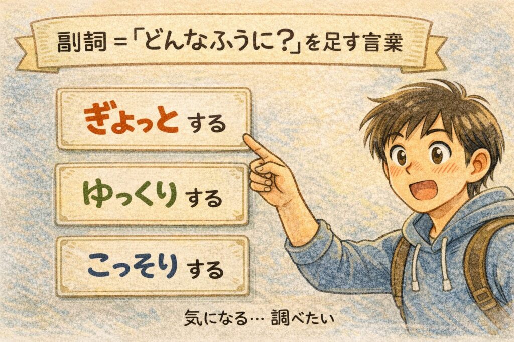 ※副詞(ふくし)とは、動作や状態(=「する」「なる」「どんなふうに」)を説明する言葉です。