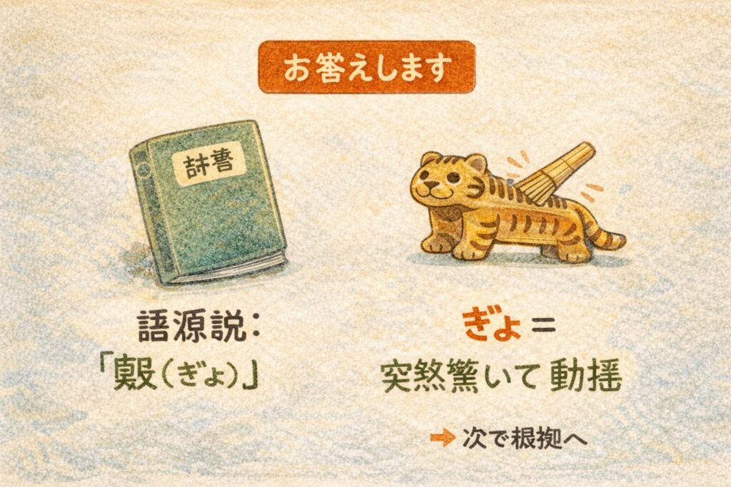 ▶では次に、「副詞の“ぎょっと”」と「楽器名の“敔(ぎょ)”」がどう結びついたのかを、根拠つきで見ていきましょう。