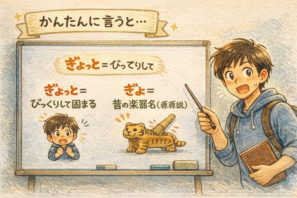 辞書で「ぎょっと」は突然驚いて心が動揺するさまだと知り、さらに「ぎょ」は中国古代の虎形の楽器**敔(ぎょ)**に由来する、という語源説が辞典に載っていることも確認できました。