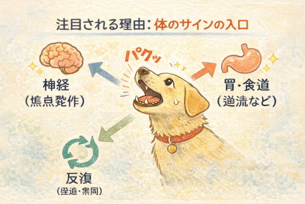 見た目が似ていても、背景は神経・胃や食道・行動など幅広い可能性があります。