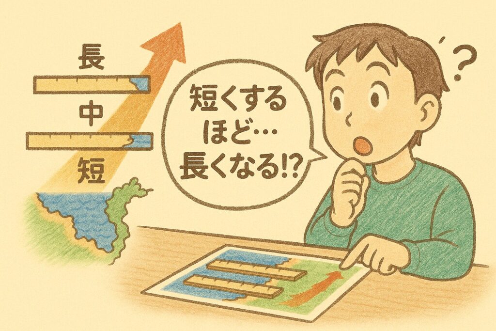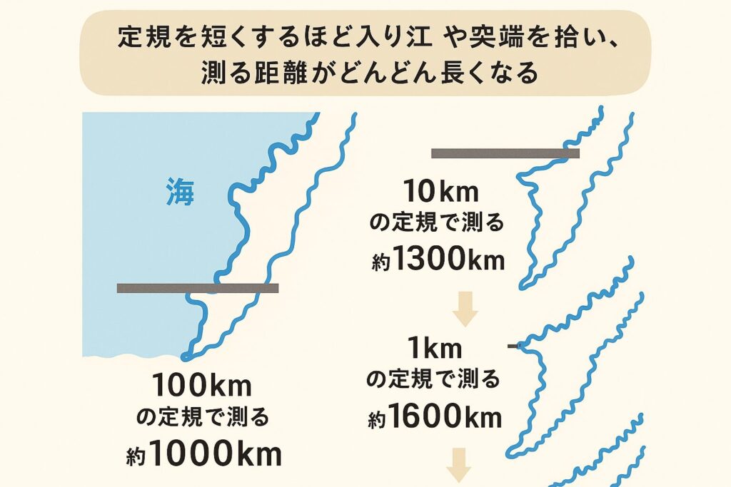 定規を短くするほど入り江や突端を拾い、測る距離がどんどん長くなる――