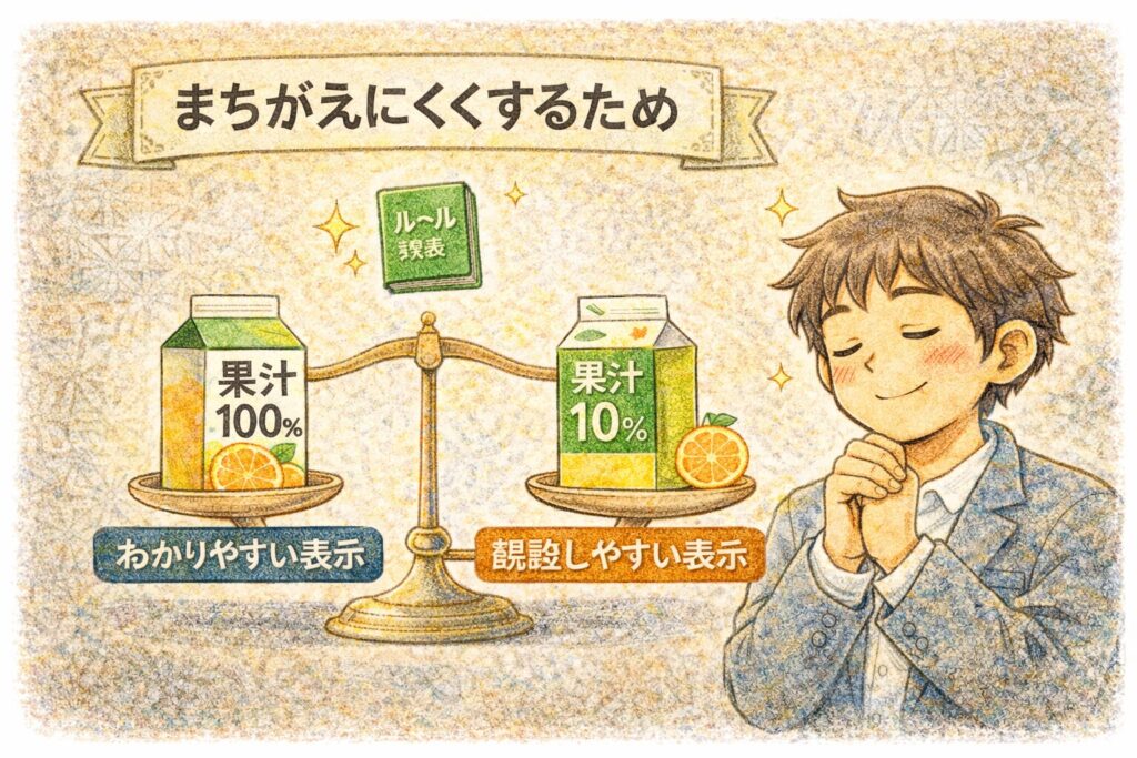 さらに、果汁がほとんど入っていない(または入っていない)のに果物っぽく見せる表示は、誤認につながるため問題になり得ます。