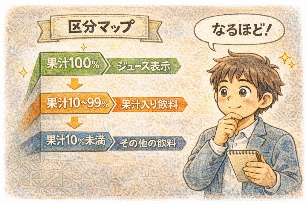 - パッケージの**見抜きポイント(果汁%・無果汁・濃縮還元・加糖)**が分かります