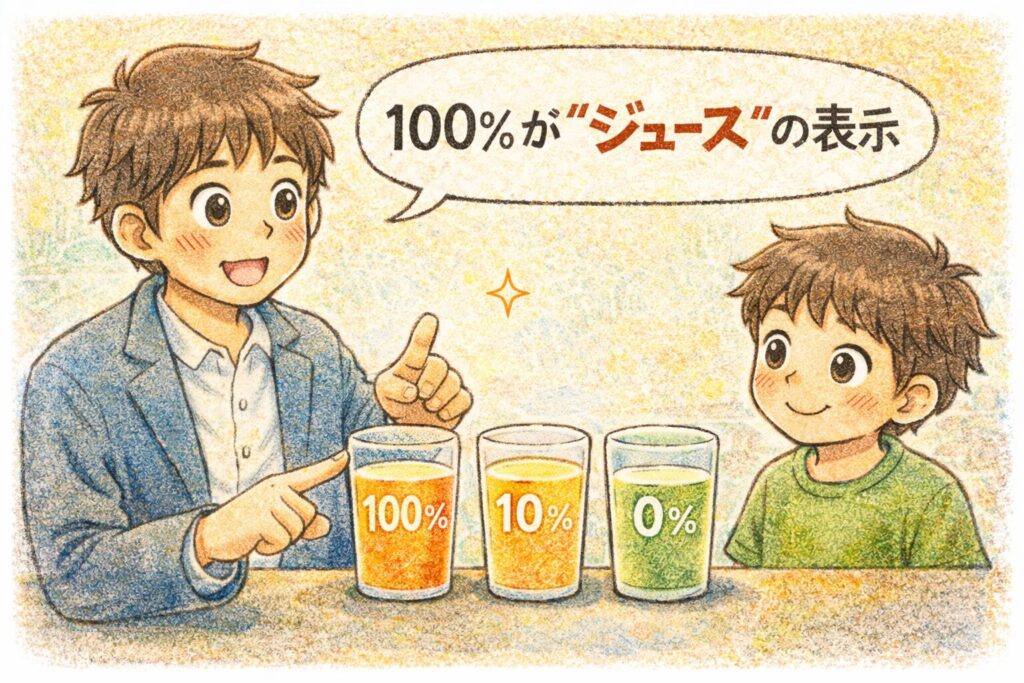 **日常会話の“ジュース”**と、**ラベル上の“ジュース(果実ジュース類)”**がズレる現象です。