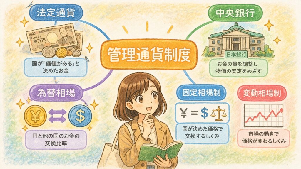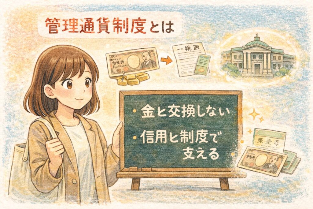 管理通貨制度とは、金(きん)と交換できることではなく、国の制度・中央銀行の運営・社会の信用によって、お金の価値を成り立たせる仕組みです。