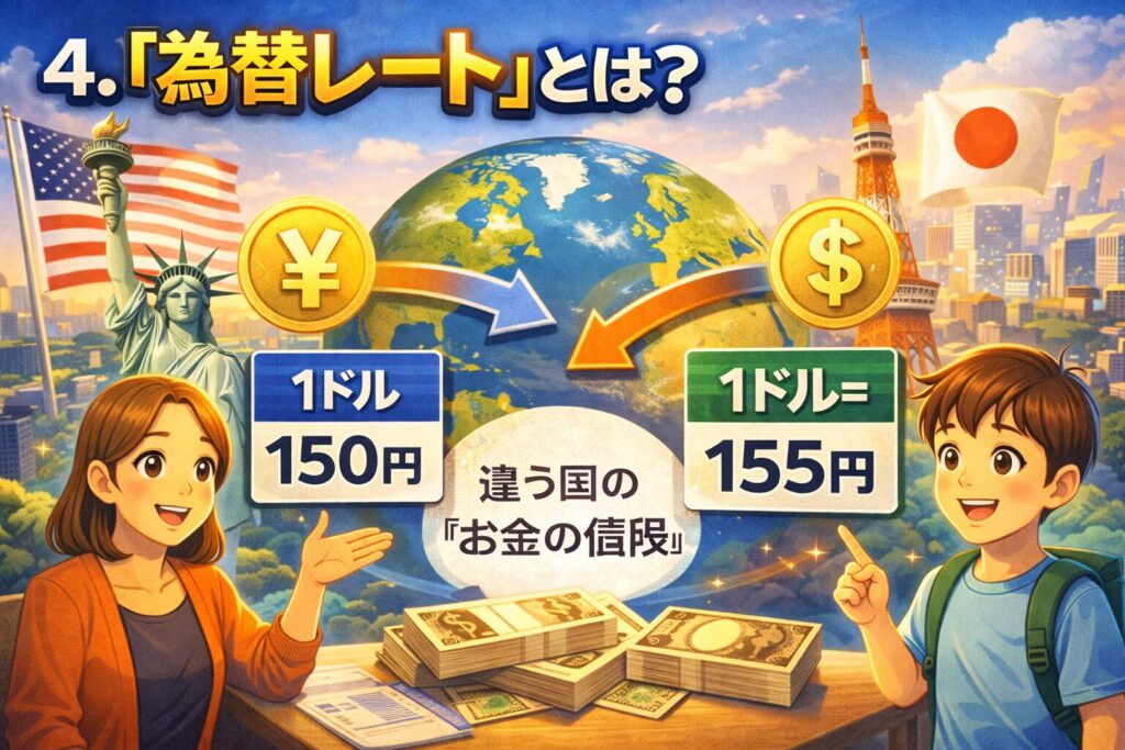 為替レートとは、円やドルなど、違う国のお金を交換するときの比率です。
