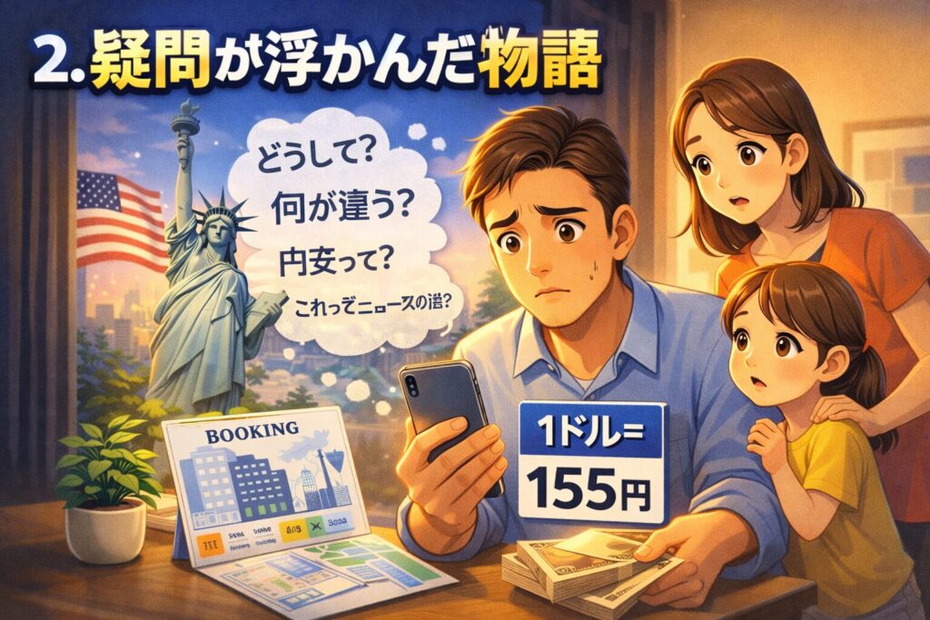 行き先はアメリカです。ホテルや観光の予定を立てながら、最後に「ドルをどれくらい用意しようか」と考えて、スマートフォンで為替の数字を開きました。