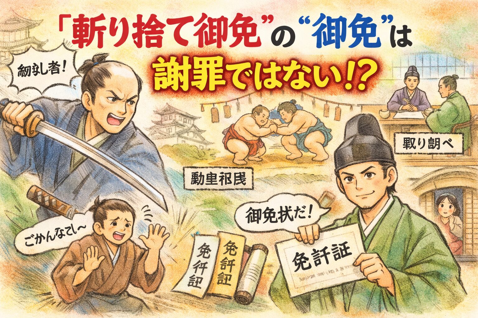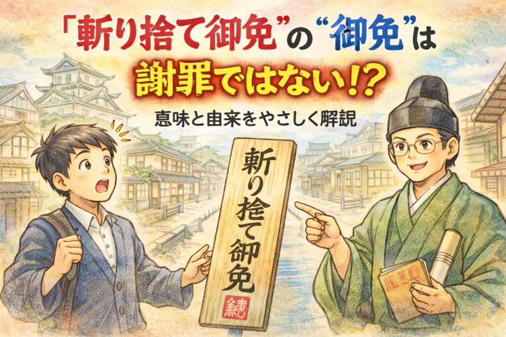 結論:『斬り捨て御免』の『御免』は、ここでは「ごめんなさい(謝罪)」ではなく、許可・赦しに近い意味です。