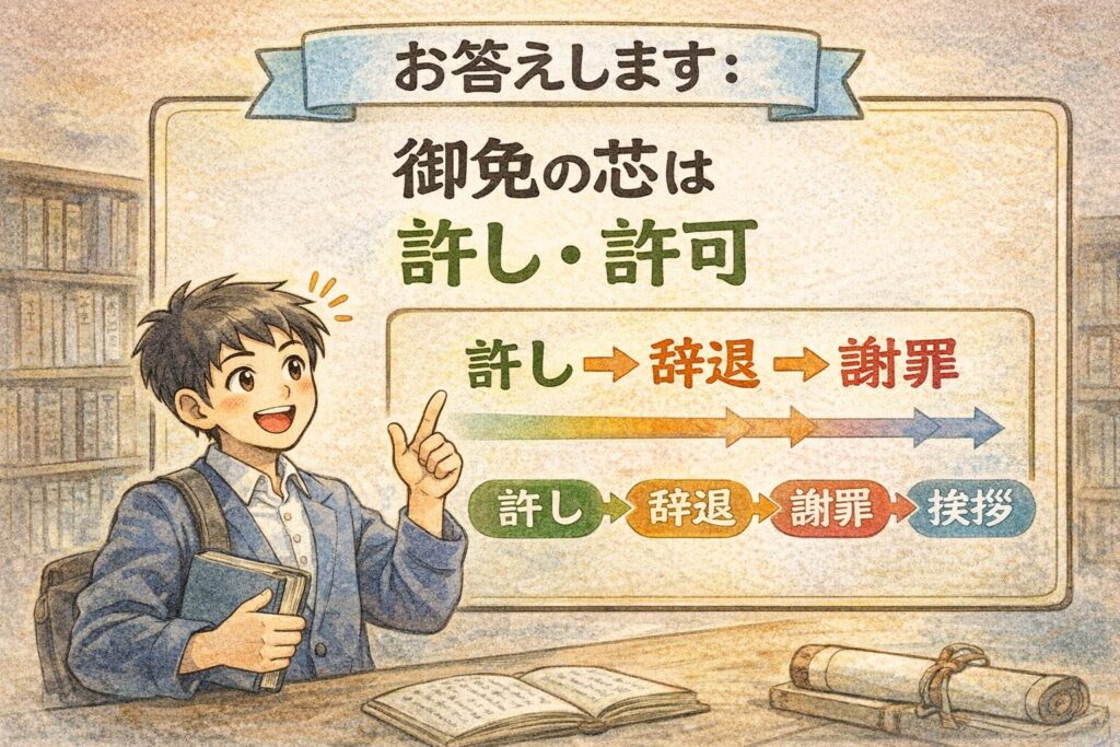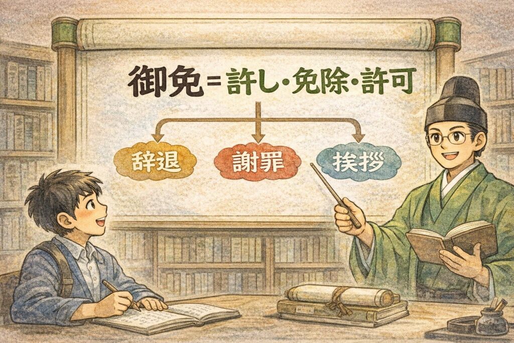 辞典上の説明では、**「御(尊敬)+免(ゆるす)」**の構造で説明されます。