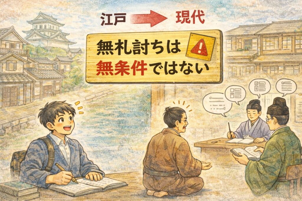 さらに「切捨御免(きりすてごめん)」は、江戸時代の武士の身分特権(無礼討ち)を指す言葉ですが、無条件ではなく、事後の取調べや要件がありました。あとで“本当に要件を満たしていたか”を確認される仕組みだった、ということです。