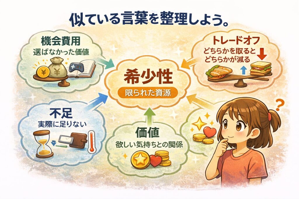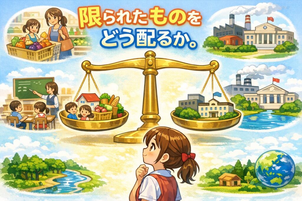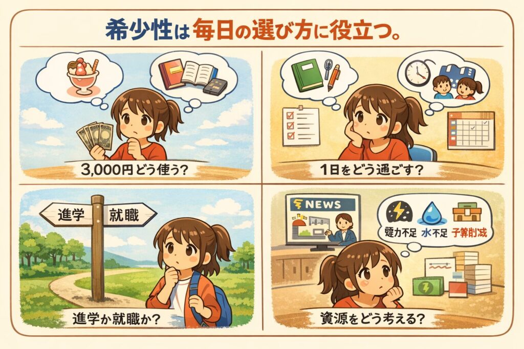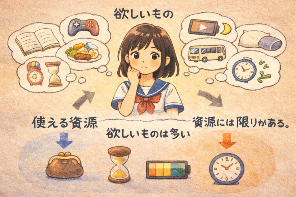 つまり、ものや時間、お金などの資源に限りがあるため、欲しいものや必要なものを全部は手に入れられないことです。