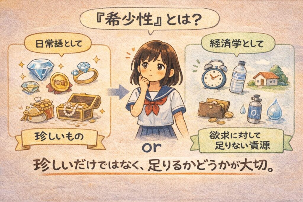 『希少性』とは、欲しいものや必要なものに対して、それを手に入れるための資源が足りない状態のことです。