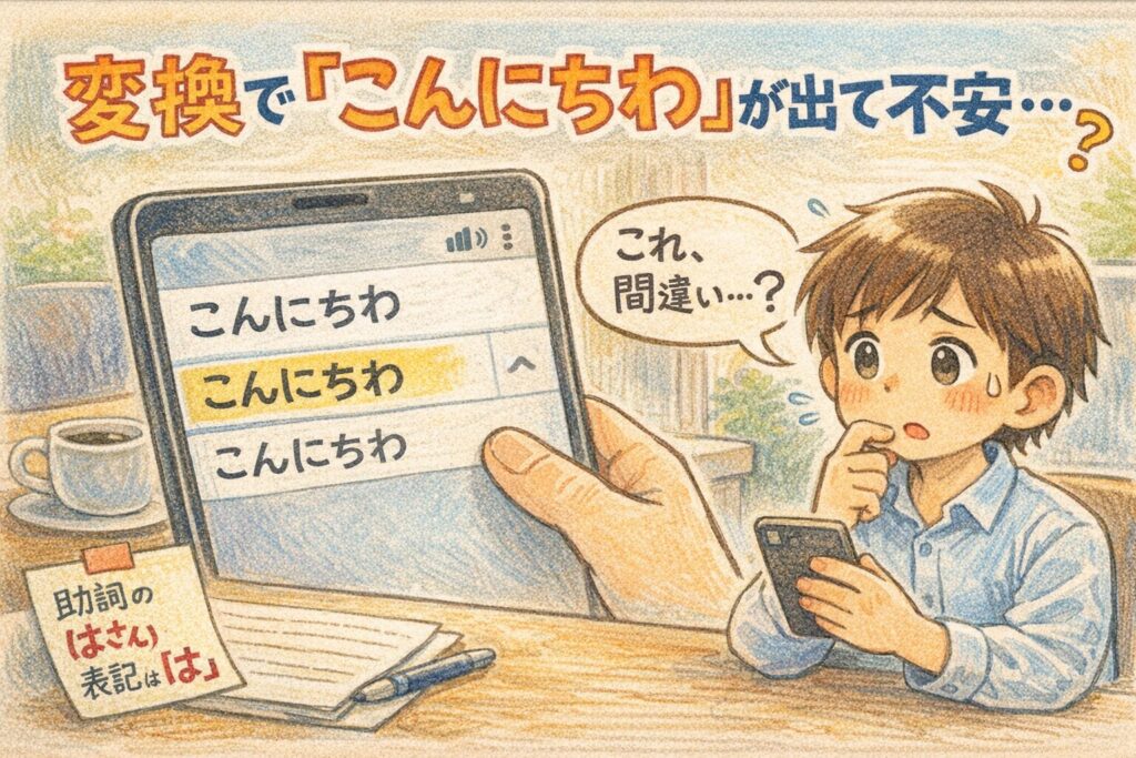 スマホで「こんにちわ」と打ったら、変換候補にそのまま出てきて、つい送ってしまいそうになった。