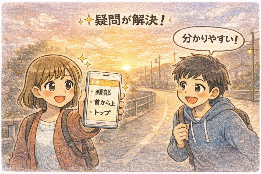- **首=どこまで?(頭?頸?)**が、文章で説明できるようになる